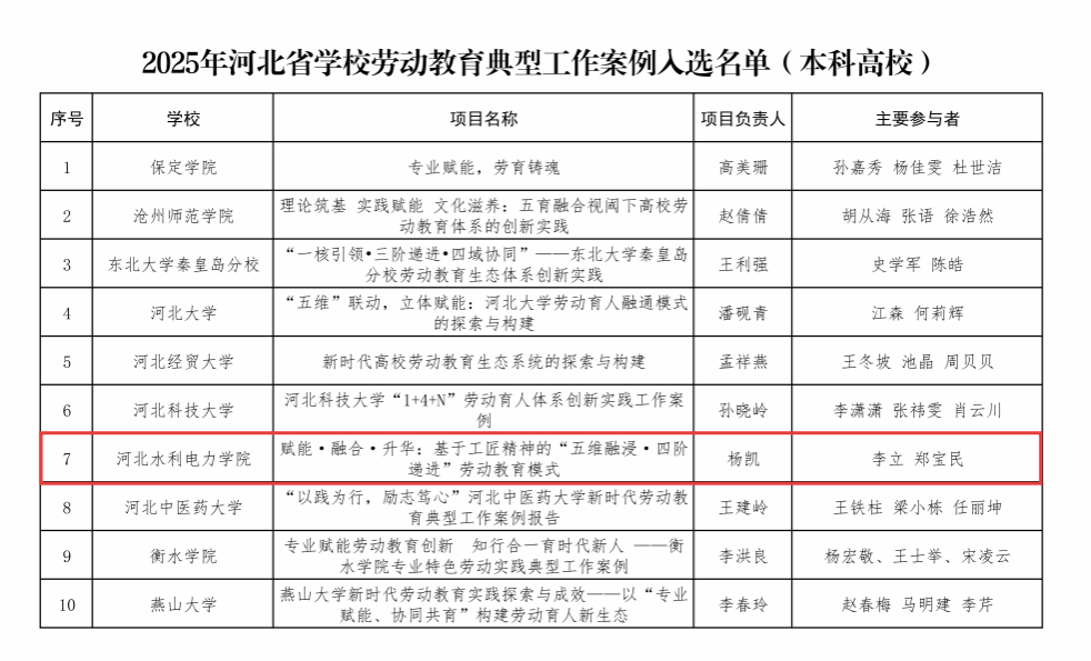 近日,河北省教育厅公布了2025年学校劳动教育典型工作案例和优秀教学设计的遴选结果。经单位推荐、专家评审与综合评议,我校申报的《赋能·融合·升华:基于工匠精神的“五维融进·四阶递进”劳动教育模式》在众多案例中脱颖而出,成功入选2025年河北省学校劳动教育典型工作案例(本科高校组),这标志着我校在劳动教育领域的持续探索与实践成效获得了充分肯定。