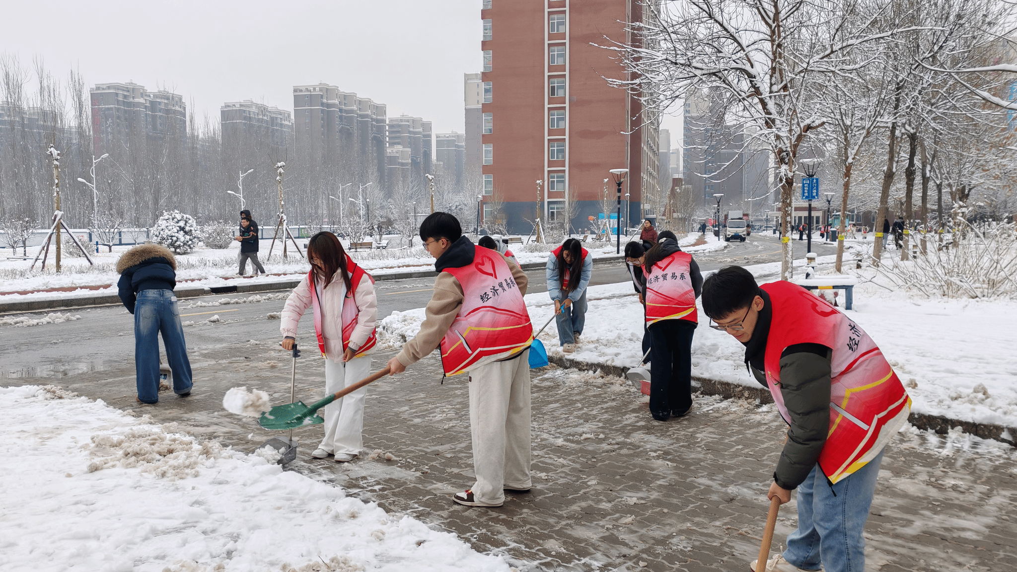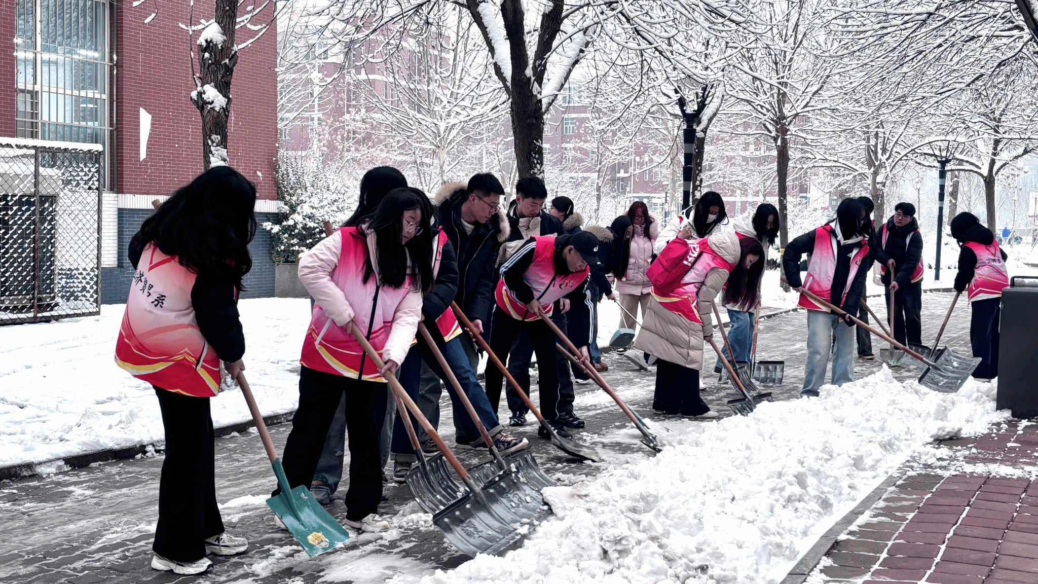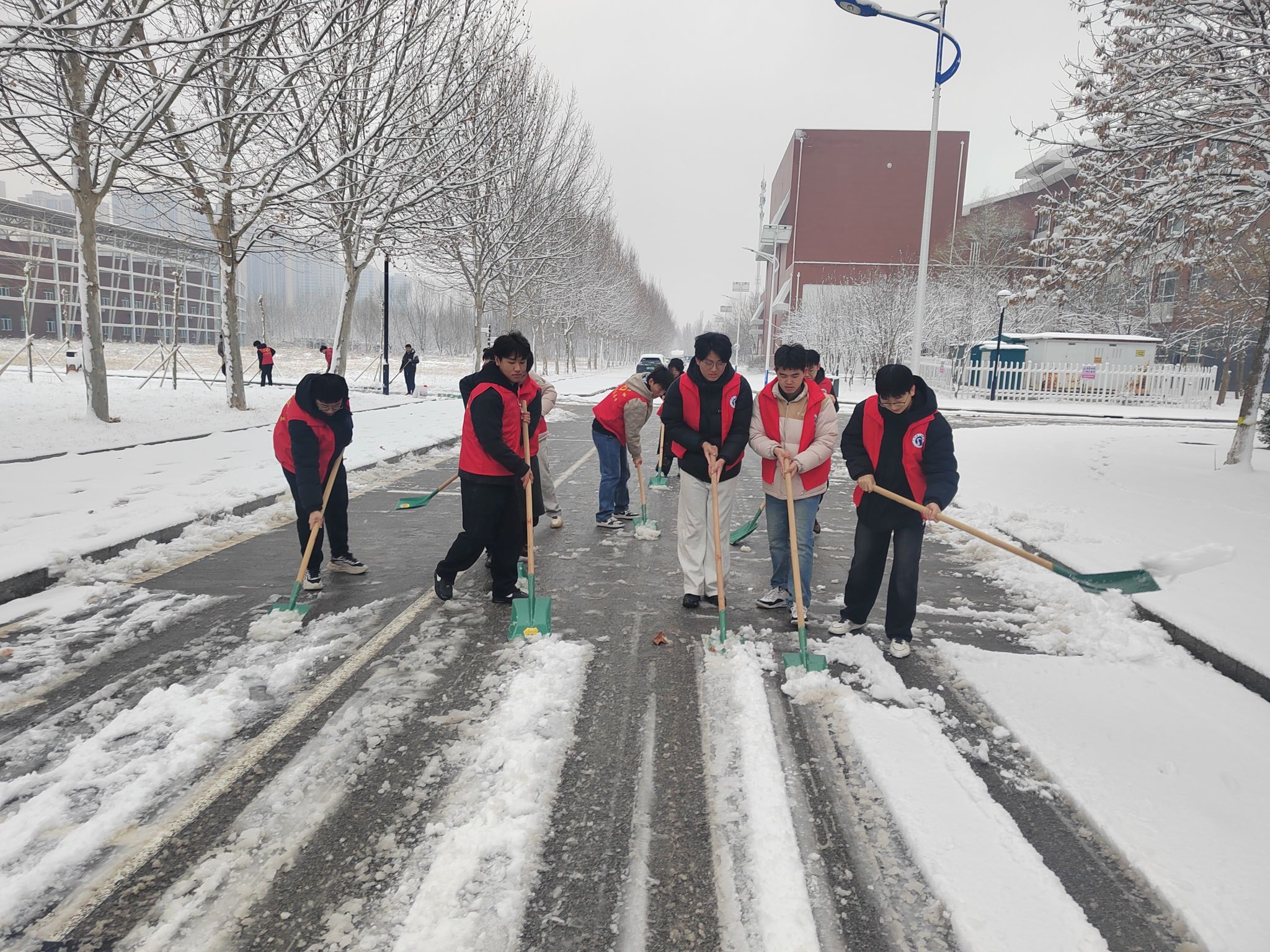 在扫雪过程中,同学们充分发扬了“奉献、友爱、互助、进步”的精神。大家不畏严寒,干劲十足,忙碌的身影在皑皑白雪中构成了一道亮丽的风景线。经过几个小时的连续奋战,原本积雪覆盖的校园主干道、教学楼前、宿舍区通道恢复了畅通,一条条洋溢着温情的“平安路”被开辟出来,为师生的安全出行提供了坚实保障。