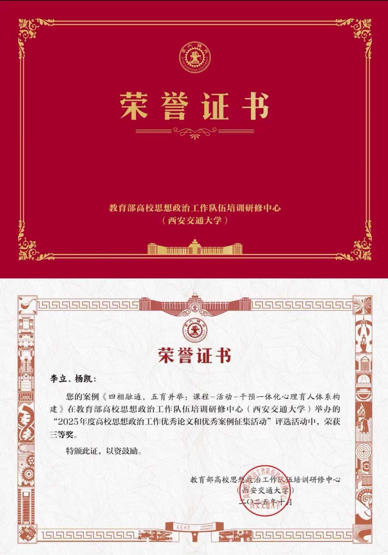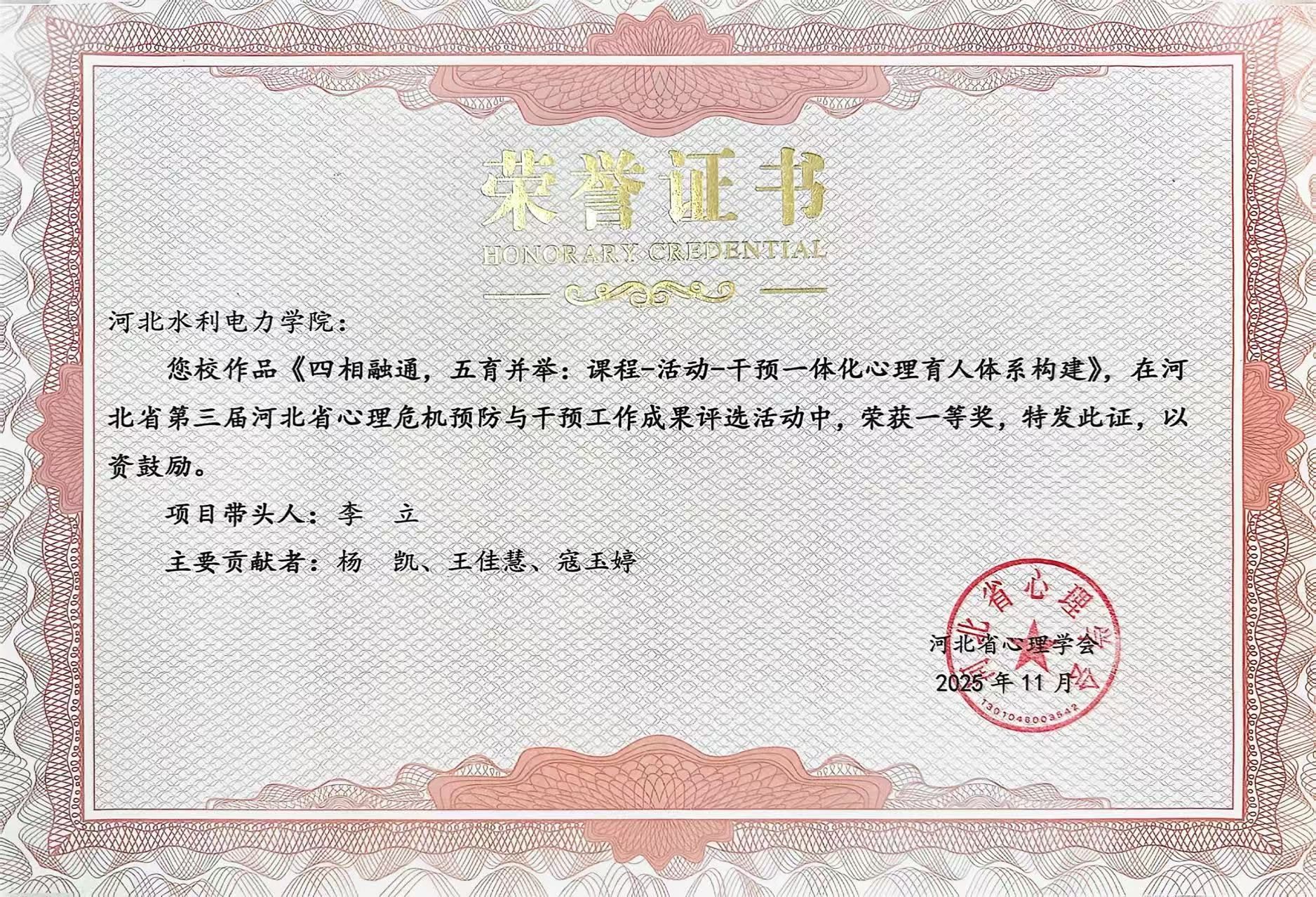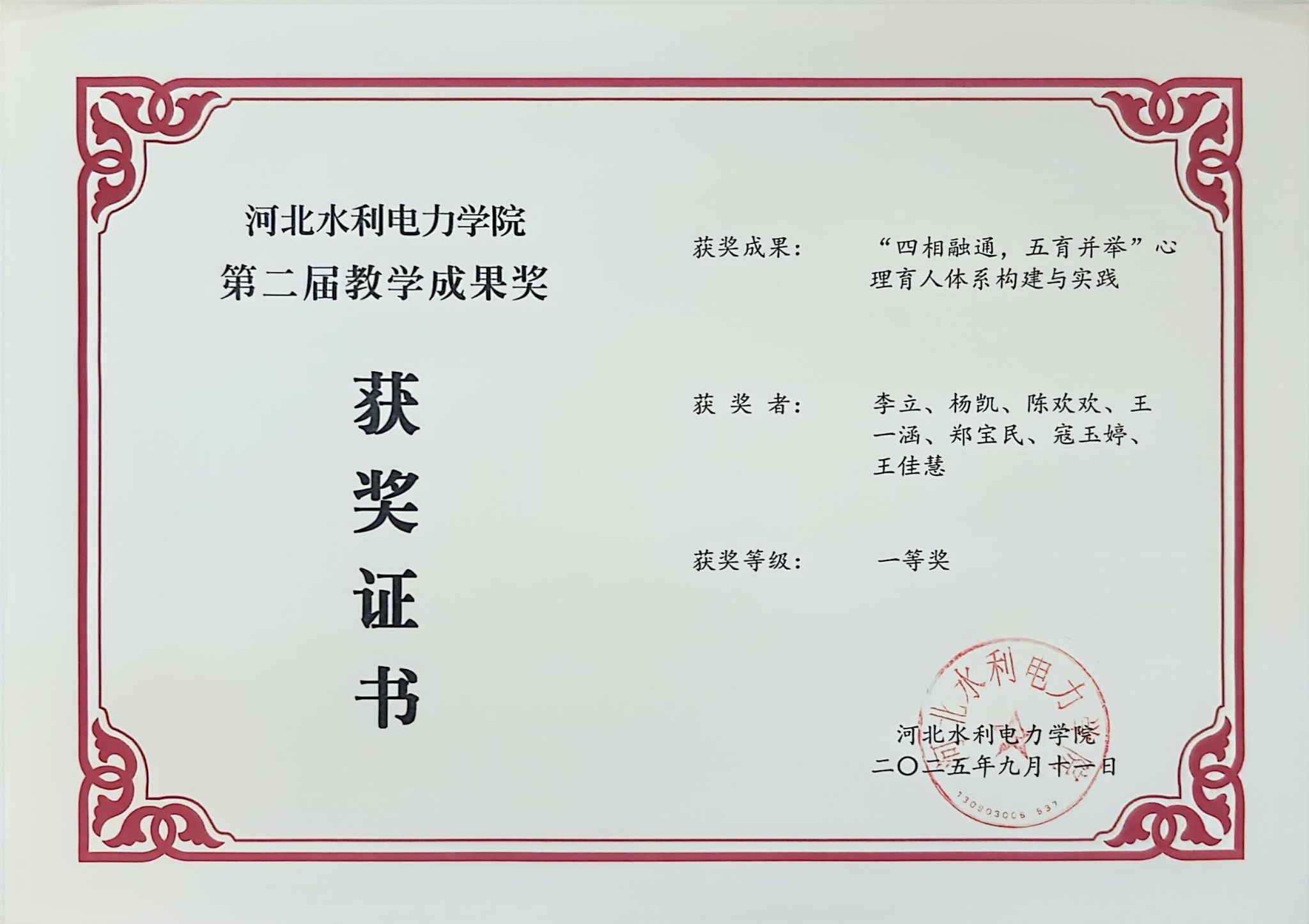 《四相融通,五育并举:课程-活动-干预一体化心理育人体系构建》获教育部“2025年度高校思想政治工作优秀论文和优秀案例征集活动”三等奖、河北省“第三届心理危机预防与干预工作成果评选活动”一等奖、河北水利电力学院第二届教学成果一等奖。